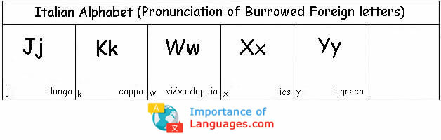 The Italian varies quite a bit from the English Alphabet. Because Italian only has 21 letters. The letters j, k, w, x, and y are missing from the Italian alphabet but they do however appear in words borrowed from other languages.